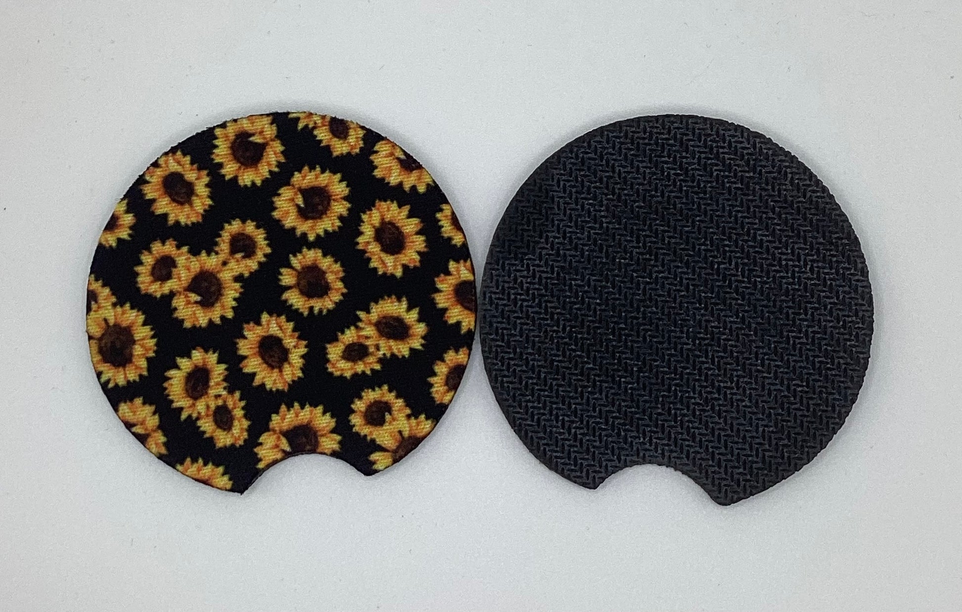 Each set includes 2 matching neoprene coasters, designed to fit most standard car cup holders.