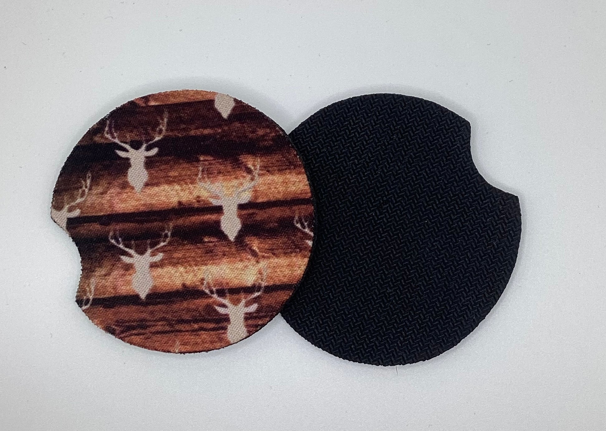 Woodgrain Deer Buck head, Neoprene Car Coaster, 2pk